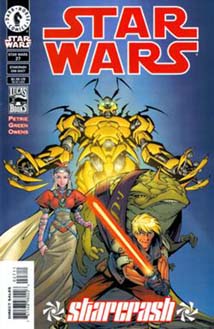 I was excited to re-read the one-shot “Starcrash” (Issue 27, February 2001), seeing that it was written by “Buffy” veteran Doug Petrie, but there’s a reason why I didn’t remember it. A Padawan whom we’ll never hear from again crashes on a planetoid we’ll never visit again and falls for a princess we’ll never see again. Taken alone, it’s a fun little tale that’s reminiscent of those “random royal planet” standalones from the Marvel “Star Wars” run, except without a main character. But in the midst of juicy Quinlan Vos and Aurra Sing arcs, it’s a bit annoying.