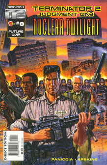 The conclusive Issue 0 gives us the first thorough portrayal (although it was touched upon in the “T2” novelization) of the reprogramming and sending back of the T-800. The good T-800 – with its newly installed chip (the one John picked up back in 1995 in “Cybernetic Dawn”) — fights off several evil ones, thus proving that the reprogramming works.