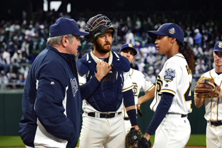 But other clichés make a viewer say “Really? They’re going there?,” like Ginny being uncomfortable with being slapped on the butt by catcher Mike Lawson (Mark-Paul Gosselaar) and the manager, as if this is her first baseball game. Then the pitcher whose injury necessitated Baker’s call-up gets in her face about how she’ll just be a trivia answer. I found this to be contrived; Baker likely knows the majority of the roster from playing with them in the minors. It’s unlikely she’d be brought into a situation where her own teammates don’t support her.