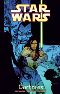 At this point in the saga of our favorite amnesiac Jedis, Aayla Secura not only hates her Master Quinlan Vos’s guts for killing her uncle Pol Secura, but she demonstrates her loathing by reviving a dark sider from suspended animation on the prison world of Kiffex and serving as his apprentice. Ostrander expands on established lore in creative ways: Volfe Karrko is an Anzati ex-Jedi who commands an army of feral Anzati (a species introduced in the “Tales from the Mos Eisley Cantina” book).