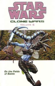 This arc masterfully merges the stories of “Republic’s” four main characters – Quinlan, Aayla, Anakin and Obi-Wan. In an informal trial before the Jedi Council, Quinlan defends his undercover actions from preceding issues – a meatier version of the “Clone Wars” Season 5 arc where Ahsoka is framed for a crime. With Quin, we (and the Jedi Council) honestly don’t know if he’s good or bad. Quin himself asks, “Have I let the dark side take me?” Quin’s monologue is beautifully interspersed with scenes of Anakin fighting Ventress to her (presumed) death. As one Jedi presumably returns to the light, another Jedi descends into darkness, with a prescient Duursema drawing Anakin in his “Episode III” Evil Face, just minus the glowing yellow eyes.