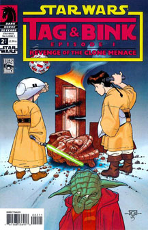 They’re all great, but the prequel issue is the funniest of the four issues chronicling the GFFA’s answer to Rosencrantz & Guildenstern. Young Tag, blessed with Corellian suaveness, hides around corners with Bink at the Naboo lake house in “Attack of the Clones” and helps Anakin say the right things to woo Padme. Padme: “We’d be living a lie. I couldn’t do that. Could you, Anakin? Could you live a lie?” Tag (whispering to Anakin): “Now dude, trust me. Agree with her, and then turn and walk away real cool, like you don’t really need her.” Anakin: “No, you’re right. It would destroy us.” Padme (as the scene extends beyond the film): “Anakin, wait!” (She pulls Anakin into a deep kiss.) Bink: “That’s amazing.” Tag: “Yeah, it’s sad, but that kinda stuff works all the time. It’s the ‘catch-and-release’ principle.”