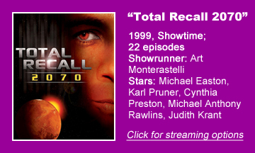 “Total Recall 2070” (1999, Showtime) is two degrees removed from Philip K. Dick — a 22-episode reimagining of the 1990 movie adapted from Dick’s short story “We Can Remember It for You Wholesale.” But actually, while it’s further from the story of “Wholesale” than the film is, it takes a step closer to an overall Dickian feel.