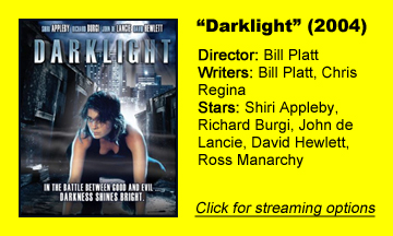 “Darklight’s” cast also includes Richard Burgi (Season 1 of “24”) as a mentor who – more because of the screenplay than the acting – doesn’t have much chemistry with his charge. “Star Trek: The Next Generation’s” John de Lancie is also on hand as one of the church dudes who, in a convoluted and boring way, aims to get the two monsters to fight.