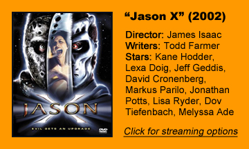 If “Jason X” parodied slashers and “Star Trek”-ian futures more consistently, it could’ve been better. Indeed, there’s a great moment toward the end when Tsunaron and KM-14 fire up a holodeck to distract Jason. They program two 1980 camping coeds who strip off their shirts and profess to Jason their interest in beer, pot and premarital sex.