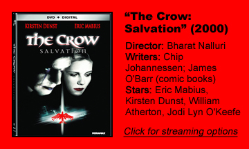 “The Crow: Salvation” (2000) is the third straight “Crow” film where I see objective filmmaking and storytelling problems, yet I still kind of like it. In fact, this one has the most coherent narrative so far, and for the first time it makes it clear – “clear” being a relative term – that the crow (as in the bird) is a familiar of the human Crow, and that the human Crow can also turn into a crow if need be.