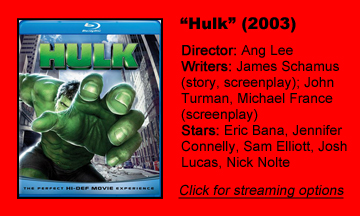 I knew this from my 2003 theatrical experience, which inspired me to call it the worst movie of the year, but I felt I owed it a rewatch. I now realize it’s not one of the worst superhero movies – it’s merely mediocre and misguided – but it’s a shame because Lee and the cast and crew clearly pour so much of themselves into “Hulk.”