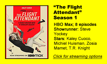 “The Flight Attendant” (HBO Max) might not be the ideal binge show. Propelled by the piano and percussion of Blake Neely’s score, the eight-episode first season (which stands alone but also sets up threads for the future) chronicles titular hot mess Cassie (Kaley Cuoco) as she gets dragged into a worldwide caper that starts with a murder in her Bangkok hotel room.