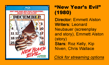 “New Year’s Evil” is one of those slasher flicks teens (or younger kids, in lenient households) would rent from the video store for a slumber party. After the 85 minutes are up and the movie has already completely left their heads, they’d say “That was dumb” and pop in something better. Like even the worst “Friday the 13th” movie.
