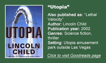 After six novels co-written with Douglas Preston, Lincoln Child goes solo for “Utopia” (2002), which I remembered as setting a high bar for all his future works (a bar he sometimes passes). Set in a cutting-edge theme park, it’s thematically on par with Michael Crichton’s movie “Westworld” (robots who can learn) and book “Jurassic Park” (the unforeseen problems of newly implemented technology).
