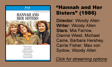 “Hannah and Her Sisters” (1986) takes a sometimes absurd but ultimately realistic view of human behavior as it chronicles a period encompassing three Thanksgivings of a New York City family and people in their circles. It’s consistently and gently humorous, occasionally sneaking in a gut-busting gag, as it slyly builds toward its overarching message that these four sisters will continue to love each other no matter what conflicts they get into.