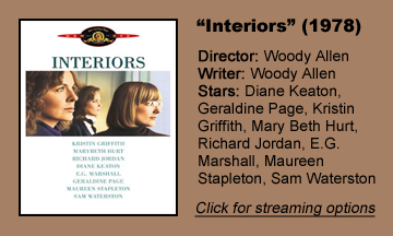 I admire “Interiors” more than I like it. Allen’s films tend to be intensely rewatchable, but this one not so much. Still, it’s impressive that it’s so engaging on one viewing – thanks to Allen’s knack for creating real people who speak naturally – considering that he offers no escapes into laughter.