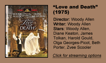 “Love and Death” sputters at the end. The narrative pays off Boris’ obsession with death, but there’s a gradual downward arc to the laugh rate. But, as is often the case in his work, Allen has a good sense for when a film is overstaying its welcome, and it wraps at 85 minutes.
