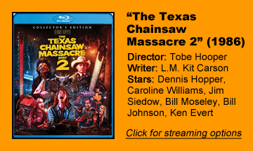 Finally delivering a sequel after 12 years and a detour to the big-time success of 1982’s “Poltergeist,” Tobe Hooper directs Cannon Films’ “The Texas Chainsaw Massacre 2” (1986) in gonzo comedic style. Probably not interested in repeating himself, and perhaps also feeling like the tropes of “Chain Saw” are silly when you look too closely at them, Hooper emphasizes the absurdity so much that IMDb lists this film as a horror-comedy.
