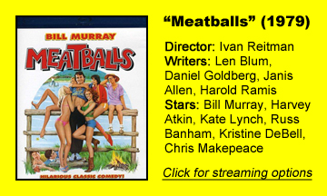 “Meatballs” (1979), one of the rare summer-camp movies I’ve seen where no one gets killed, marks the first collaboration between director Ivan Reitman and star Bill Murray. The comedy would probably be forgotten without those names, plus Harold Ramis as one of the four writers who I assume were writing it as they went along.