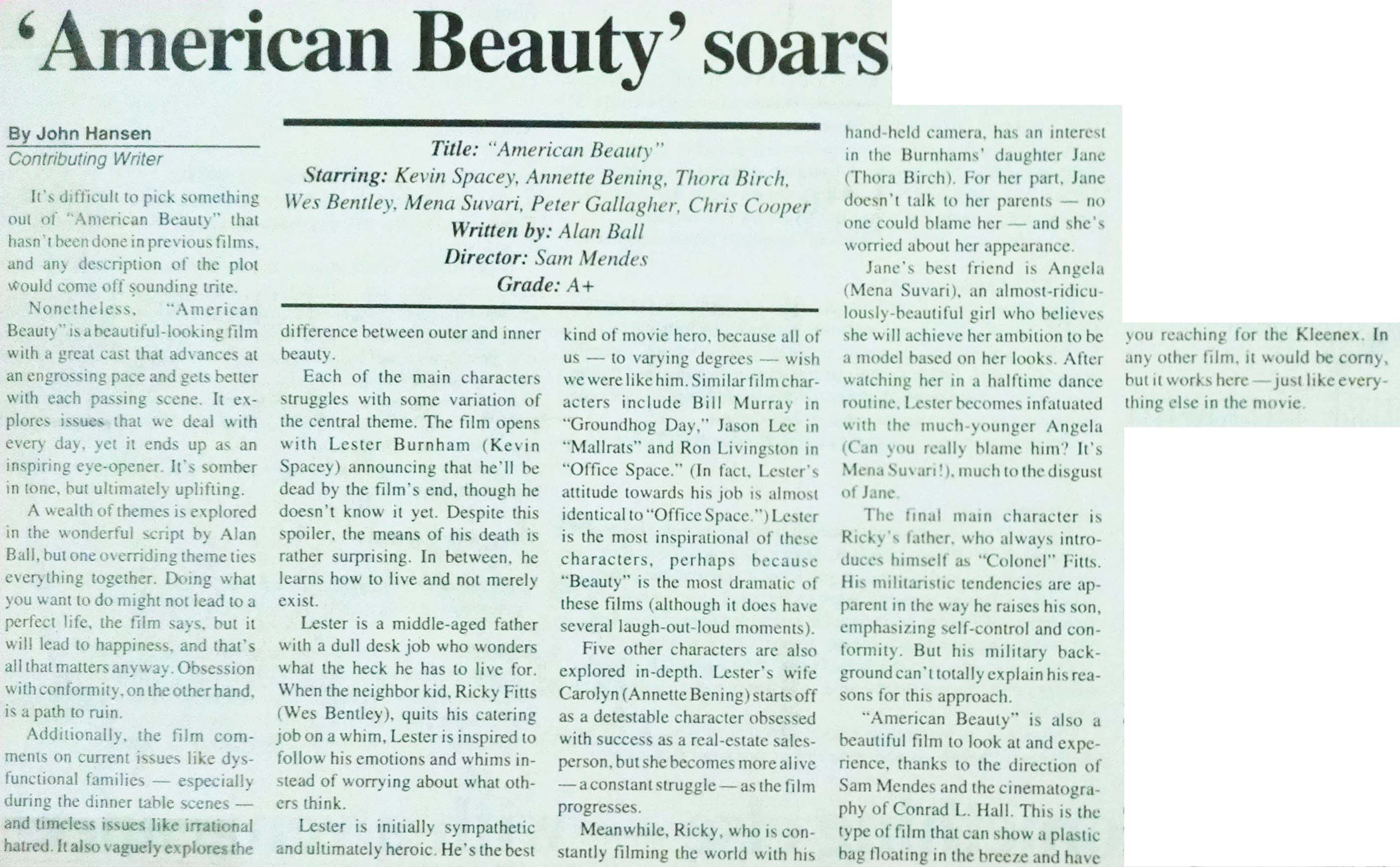 ‘American Beauty’ review John’s “American Beauty” review, NDSU Spectrum, October 1999 John’s “American Beauty” Throwback Thursday review, Aug. 28, 2025