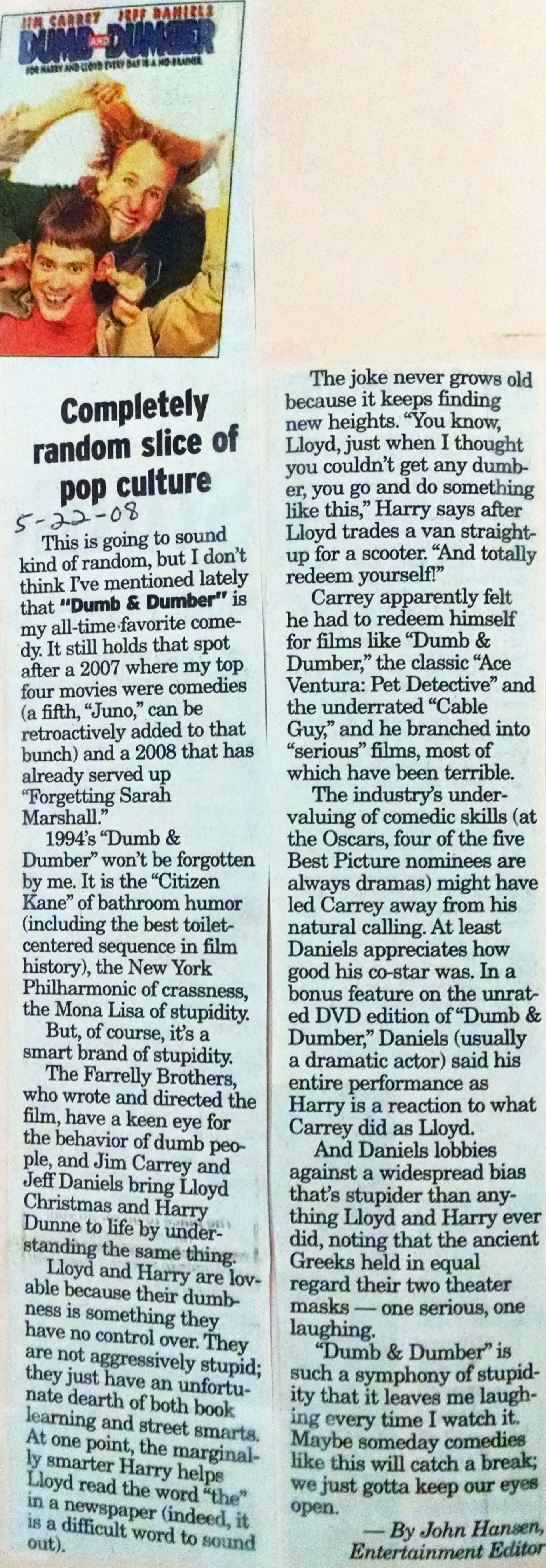 My “Dumb and Dumber” Completely Random Slice of Pop Culture review, Brainerd Dispatch, May, 22, 2008