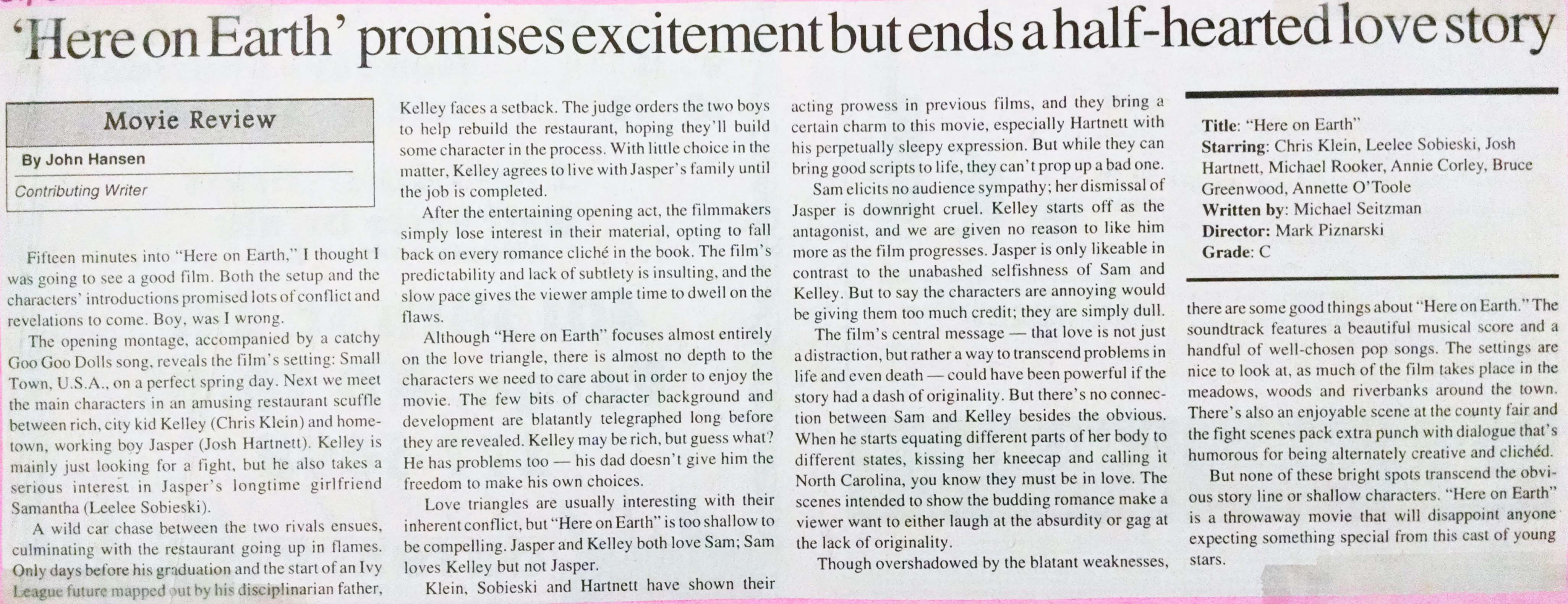 My “Here on Earth” review, NDSU Spectrum, March 2000