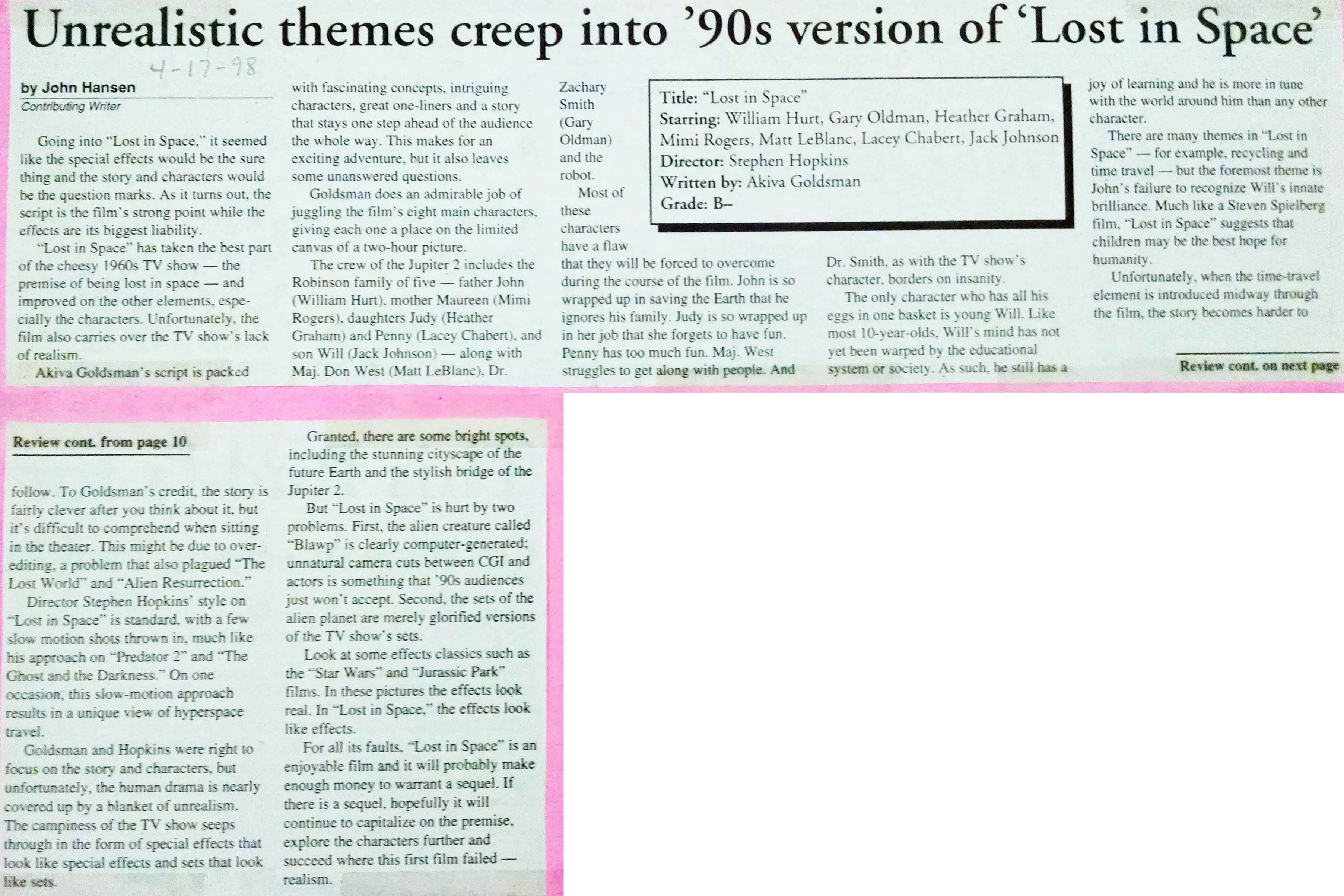 ‘Lost in Space’ reviews John’s “Lost in Space” flashback review, June 17, 2021 John’s “Lost in Space” review, NDSU Spectrum, April 17, 1998