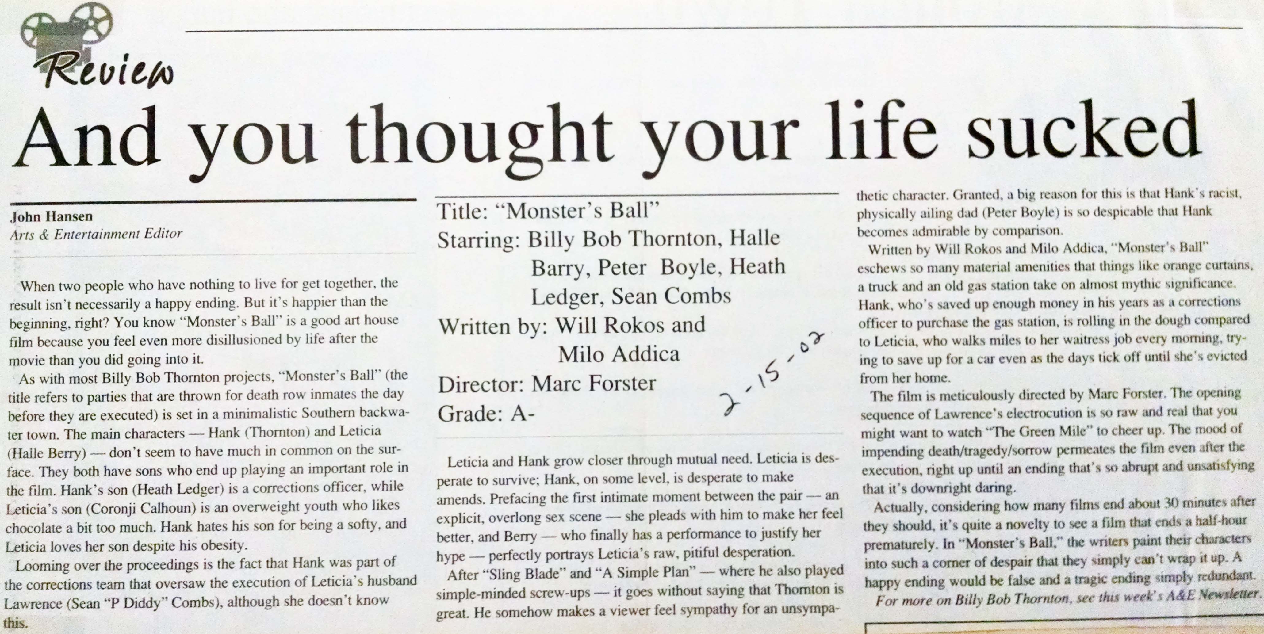 My “Monster’s Ball” review, NDSU Spectrum, Feb. 15, 2002