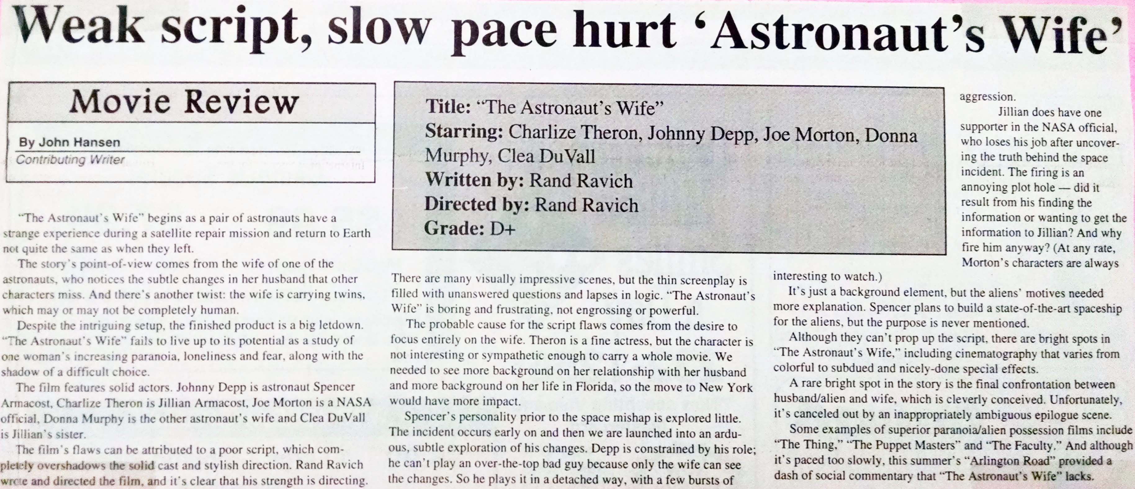 My “Astronaut’s Wife” review, NDSU Spectrum, August 1999