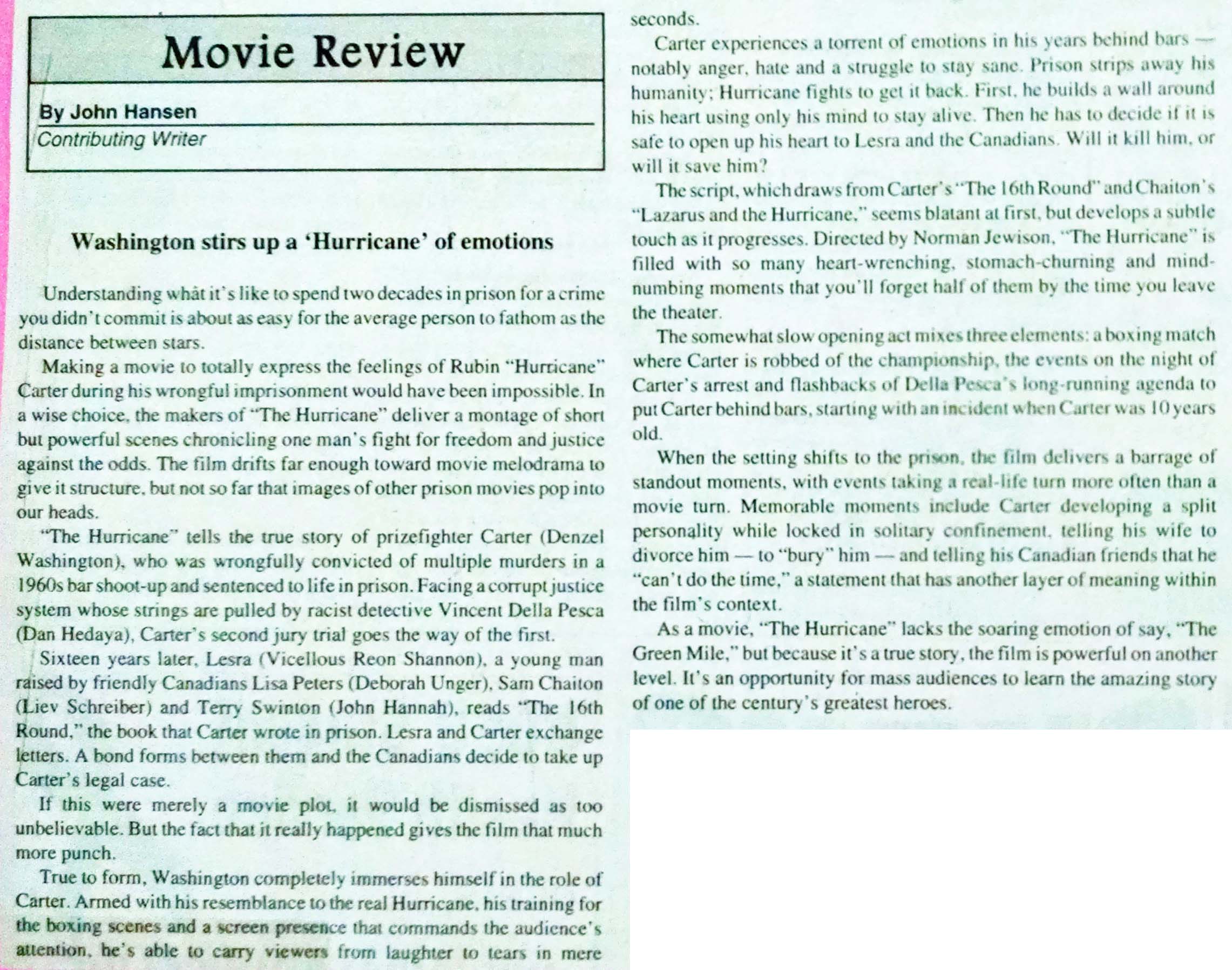 My “Hurricane” review, NDSU Spectrum, January 2000